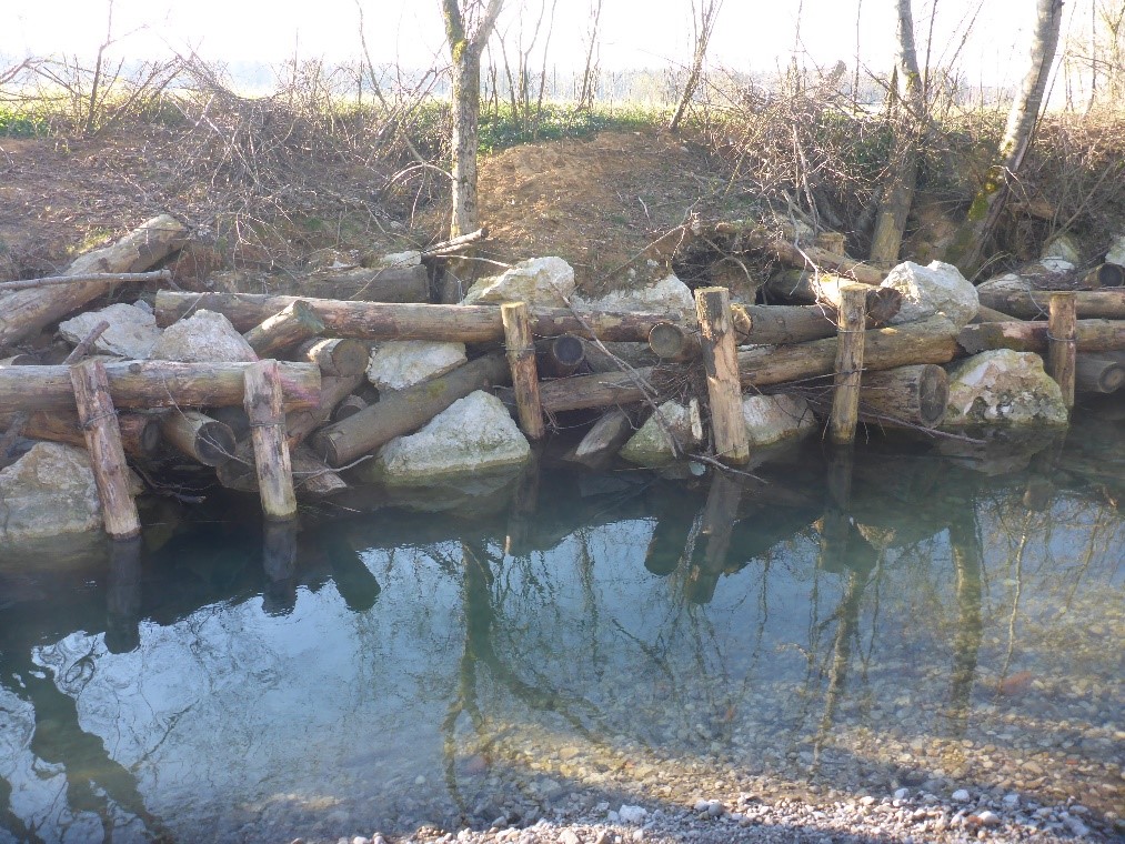 Slika 2: sonaravna utrditev brežine vodotoka Milka, z lesenimi hlodi, oblicami in kamnom