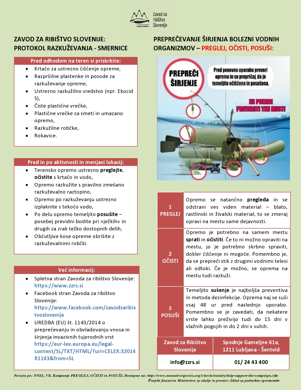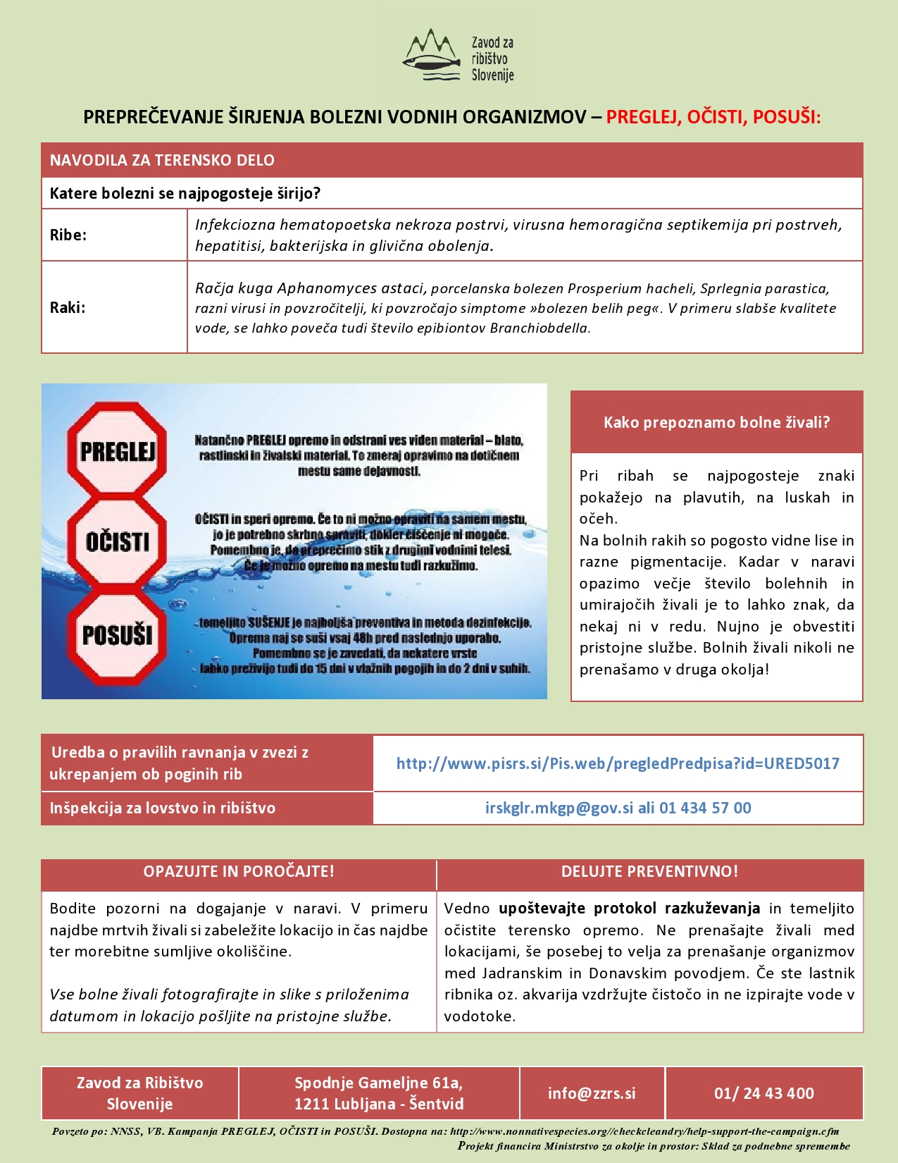 Zavod za ribištvo Slovenije želi aktivno spodbujati vse uporabnike voda, da so zelo pazljivi pri čiščenju vse svoje opreme, ki je v stiku z vodo, saj lahko le s skupnim naporom zagotovimo zdravje naših voda.